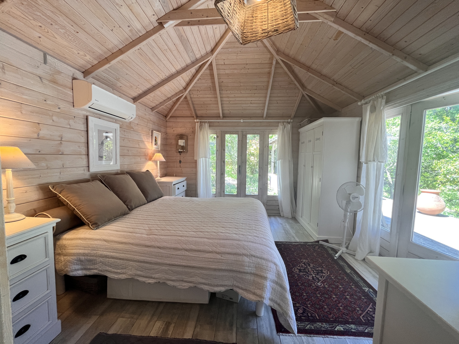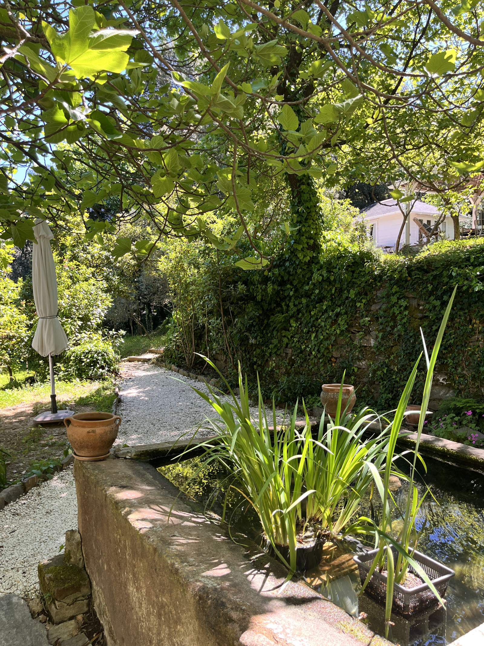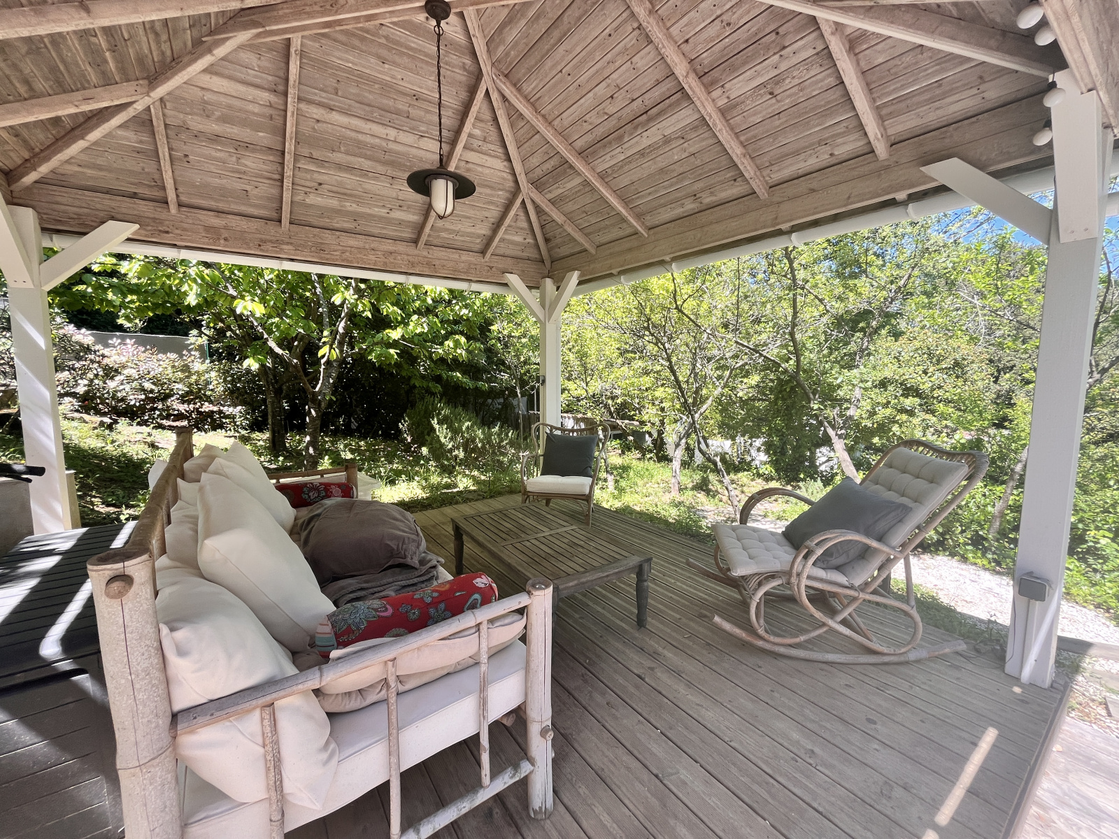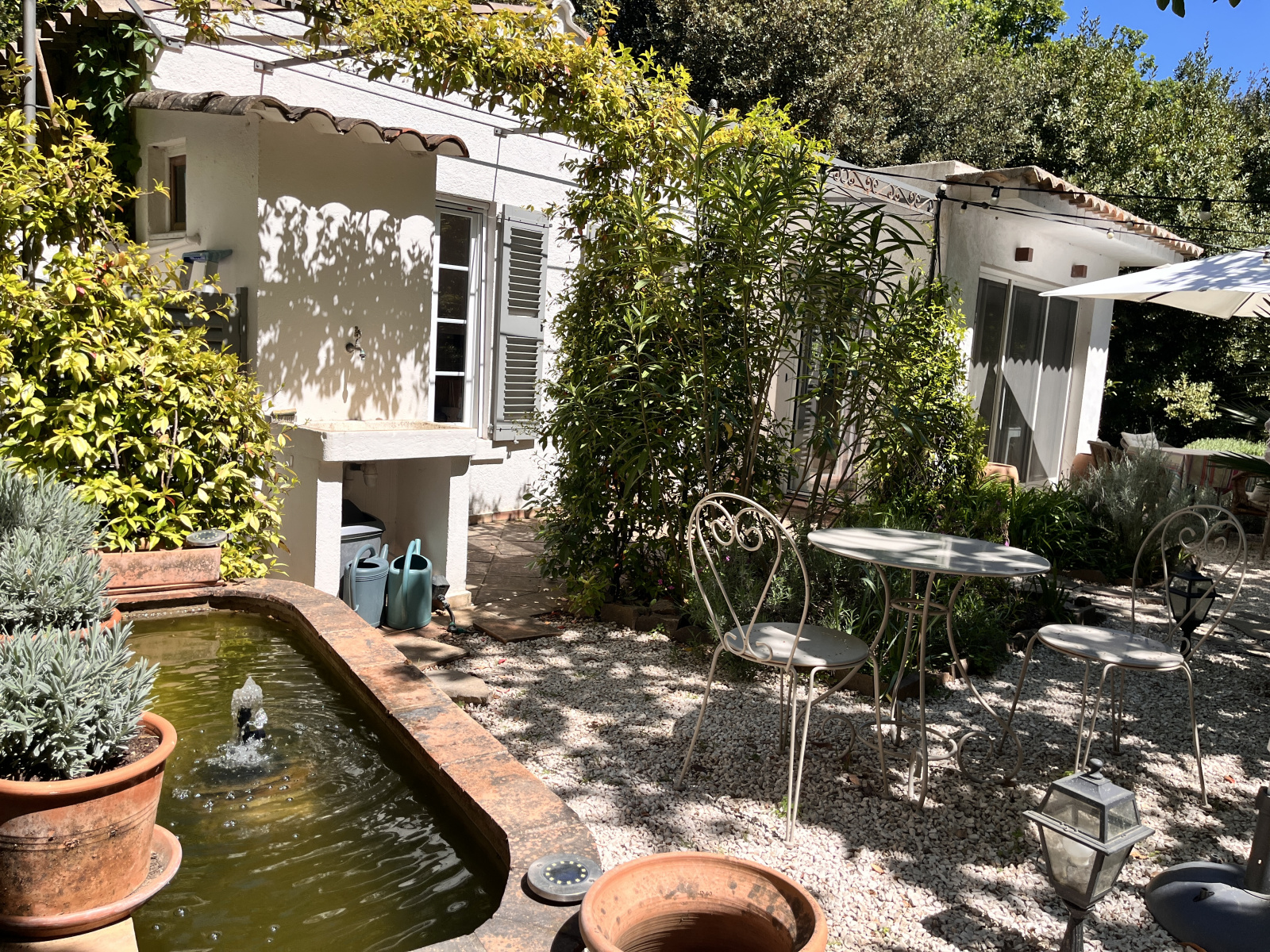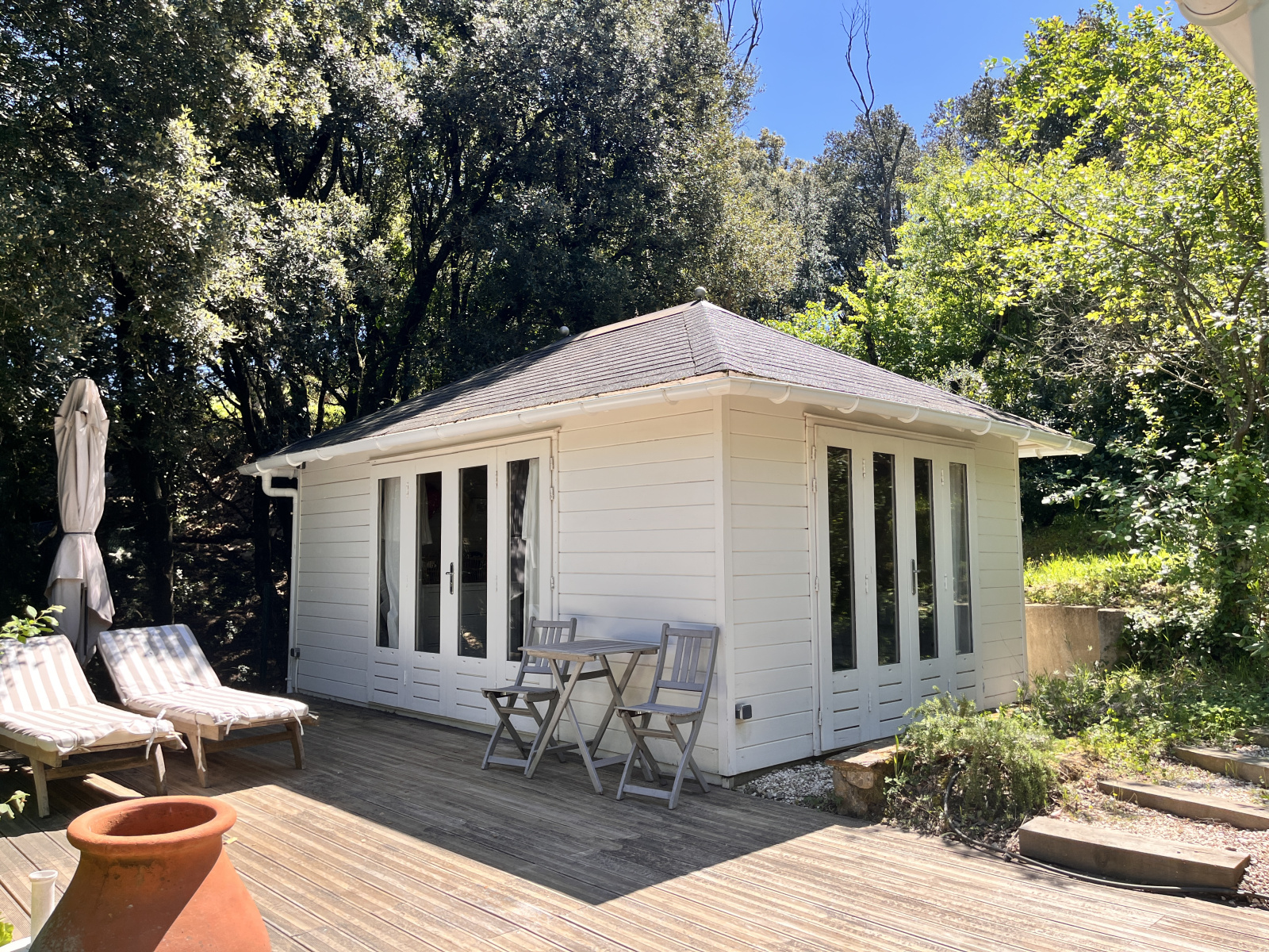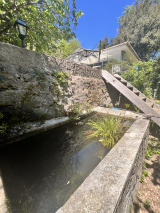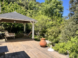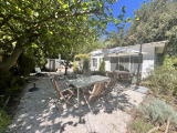 Une construction typique, des bassins, un cabanon rénové, un chalet, des marches qui serpentent dans un jardin où l'on se croirait au fond de la forêt, mais le village et ses commodités sont là, à 50 mètres. C'est une oasis de vert et de chants d'oiseaux. La première construction comprend une grande cuisine avec cheminée et un grand salon vitré. Douche et toilettes extérieurs. Une deuxième construction accueille une chambre et sa salle de douche. Un chalet en bois abrite la chambre principale et salle de douche. La terrasse couverte devant la chambre promet de belles siestes à l'ombre...